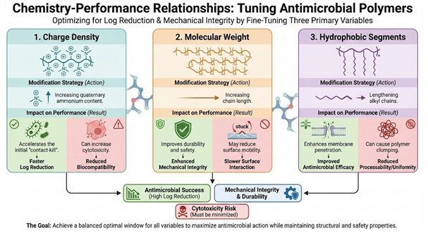 The choice of where to place the antimicrobial group on the molecular chain impacts both the biocidal speed and the mechanical strength of the polymer.