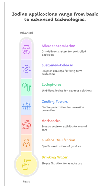 - Iodinated Resins: These solid-phase delivery mediums bind iodine to anion-exchange resins. In water treatment systems, this system releases iodine only when a microorganism comes in contact.