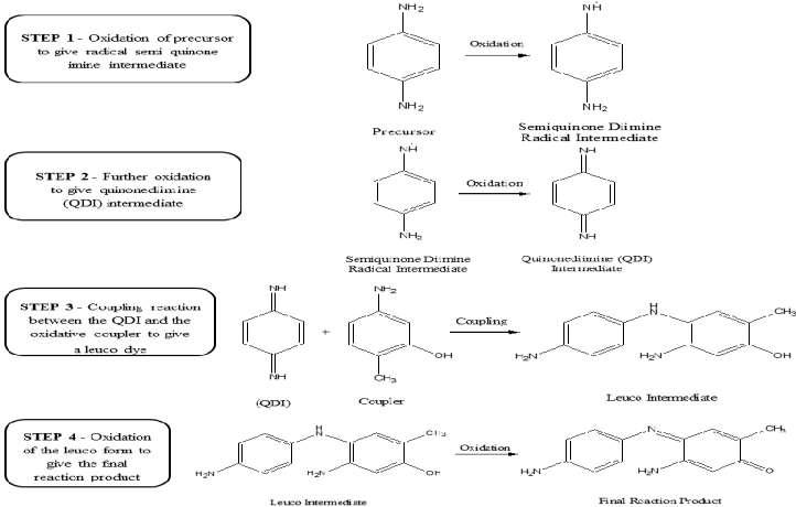 The dyeing process begins when PPD is mixed with H₂O₂ under alkaline conditions (pH 9 - 10), usually created by NH₃ or monoethanolamine. PPD undergoes oxidation to form a quinonediimine intermediate.